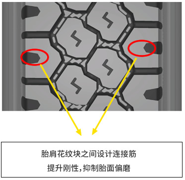 ■ 胎肩花纹块之间设置连接筋,提升胎面整体刚性抑制胎面偏磨;